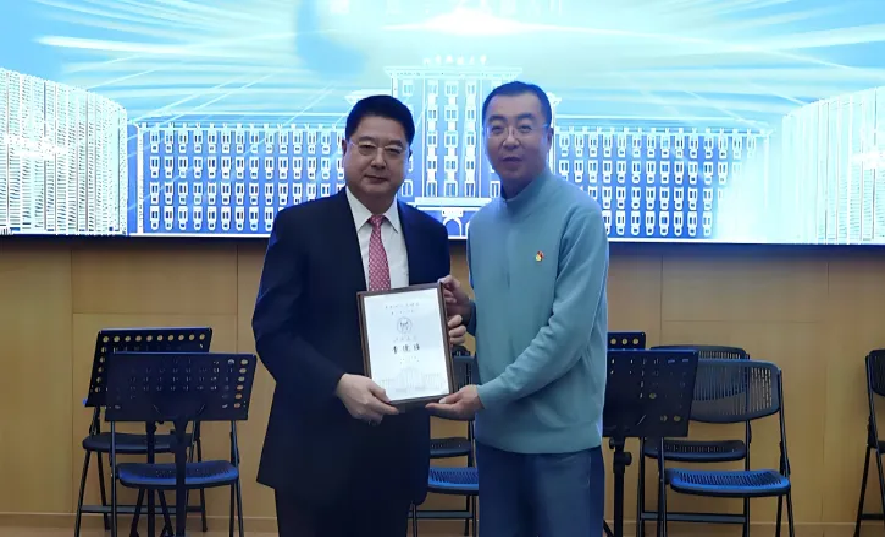 讲座结束后,王旭为曹德维颁发北京科技大学星期四人文讲座纪念牌。