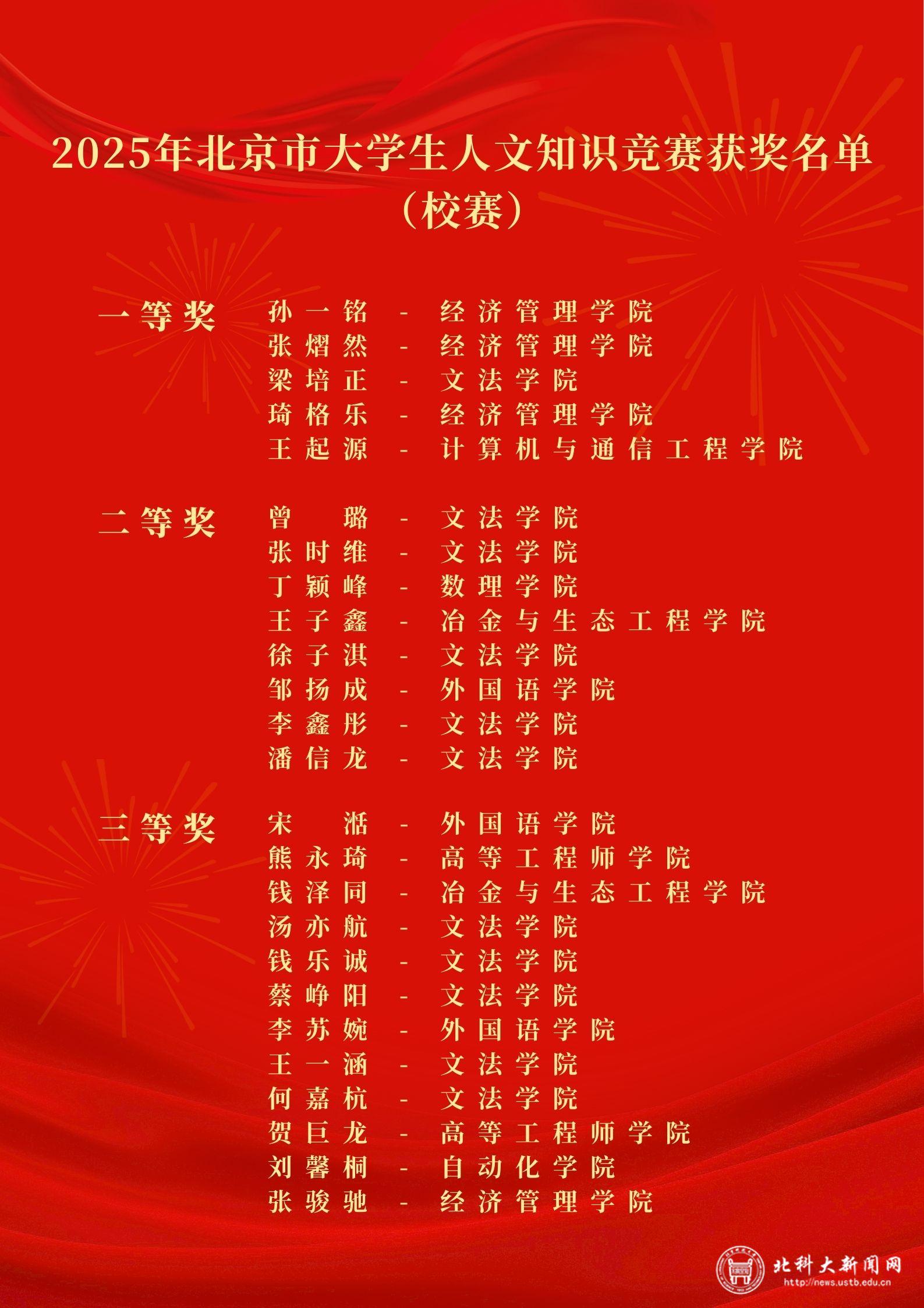 本届人文知识竞赛校内赛由学校教务处牵头,人文素质教育中心承办、精心组织,经过广泛宣传与动员,800余名本科生报名,突破历史新高,经过激烈角逐,共产生一等奖5名、二等奖8名、三等奖12名。在根据组委会赛事规则,经过校赛选拔,最终有91名学校学生晋级北京市大学生人文知识竞赛决赛个人赛。同学们充分展现了自己的文学素养、历史情怀与科学思维,共有43人获奖,其中5人获个人赛一等奖,14人获个人赛二等奖,24人获个人赛三等奖。此外,在专项赛中,1人获“2025经典之光与时代新声”单项奖。通过比赛引导学生夯实人文根基、锚定文明传承时代坐标,争做中华文明的传承者、创新者与传播者。
