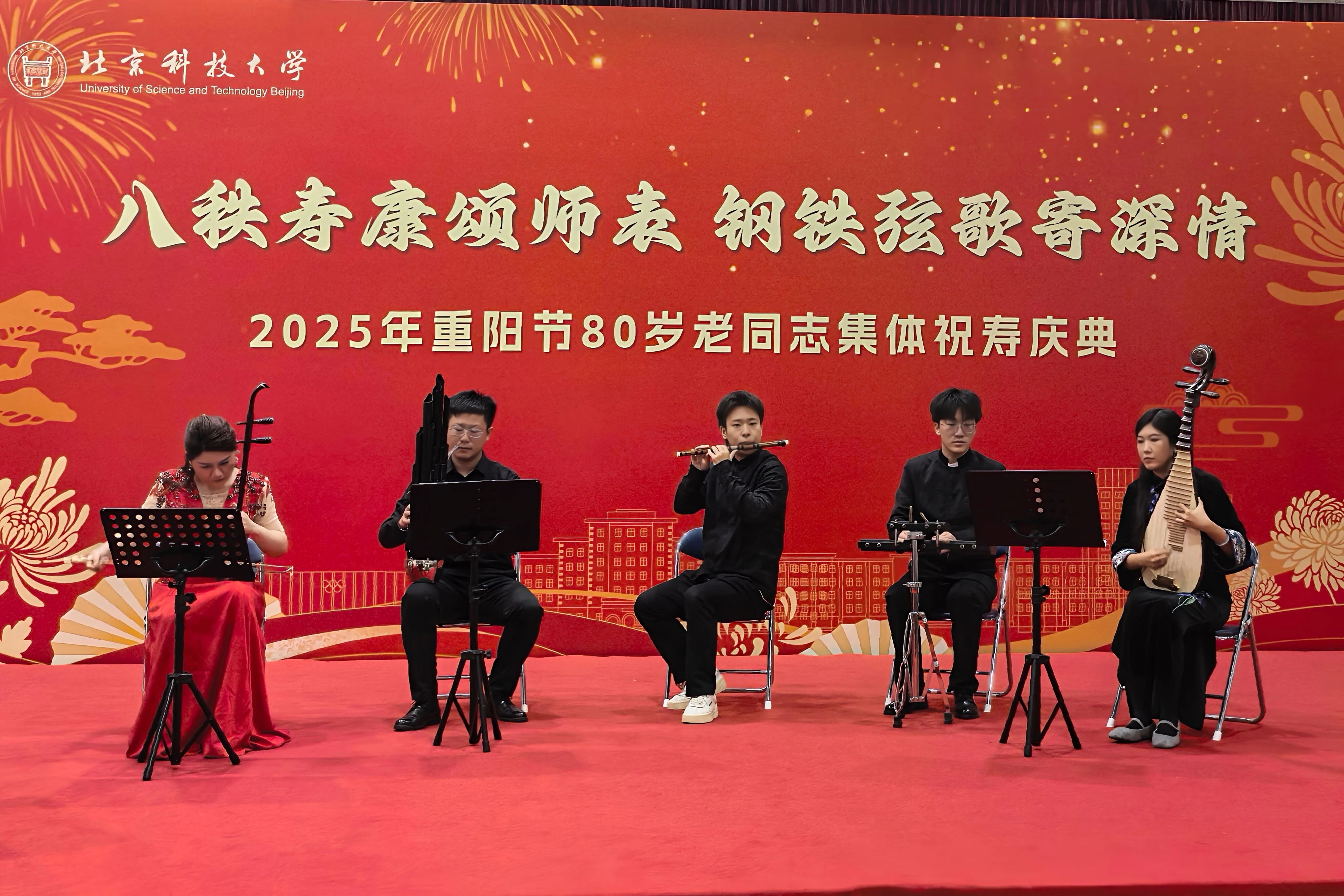 人文素质教育中心人文乐团师生代表以悠扬的民乐合奏《花好月圆》献上祝福。王婧、孟曦、段兆煦、樊锦涛、孙梓铭用二胡、笛子、琵琶等传统民族乐器交织出一幅“月圆花好、人寿年丰”的动人画卷,音符间流淌的不仅是节日的喜悦,更是对老一辈“钢铁摇篮”奠基人深深的敬意。